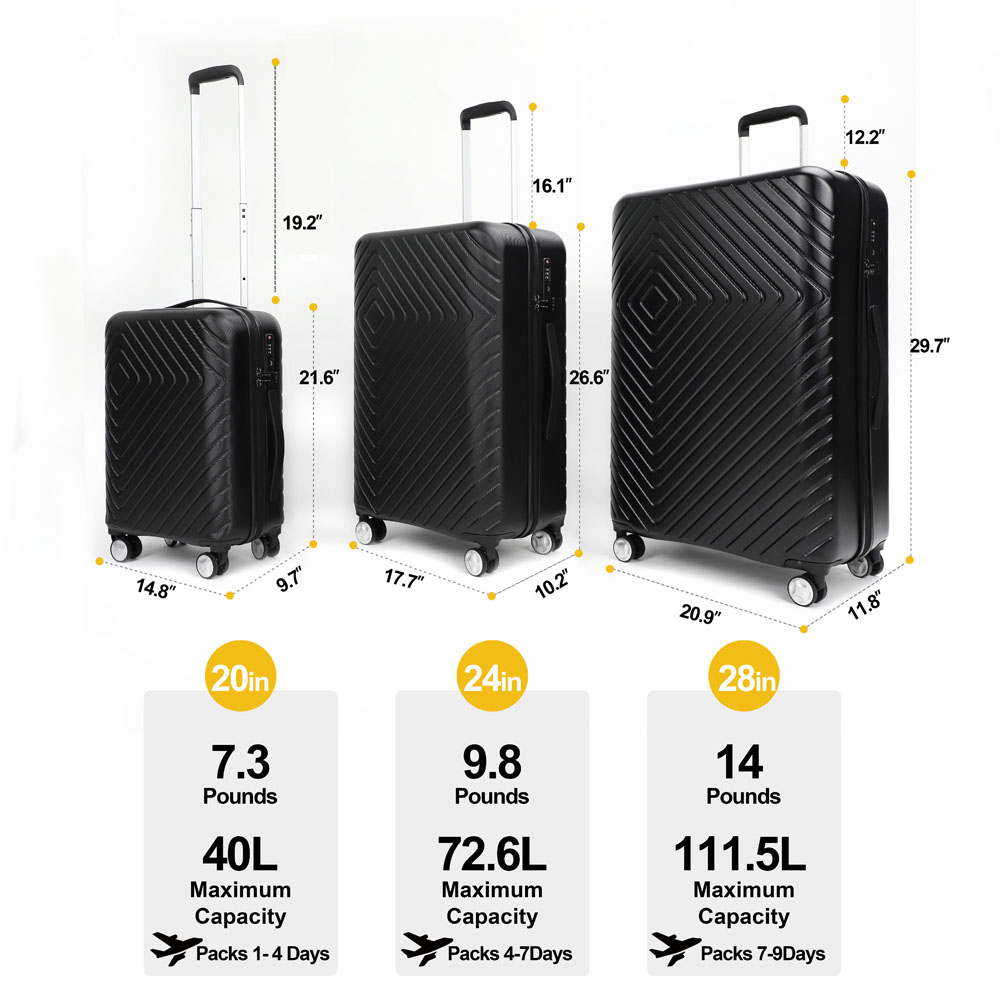 • [3 piece set luggage]: 20-inch meets all standard requirements for carry-ons on both international and U.S. based flights. Whether you’re on a business trip or a family trip, the 24-inch and 28-inch checked luggage will satisfy you.