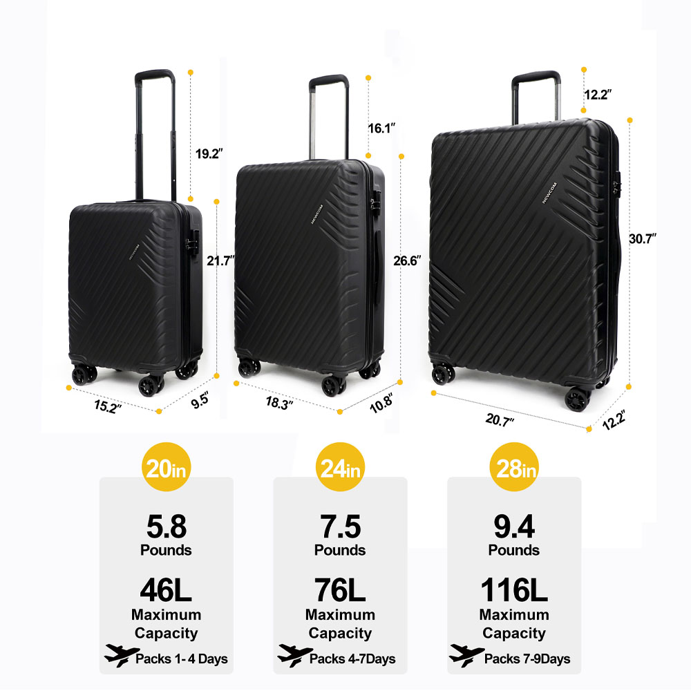 - [3 piece set luggage]: 20-inch meets all standard requirements for carry-ons on both international and U.S. based flights. Whether you’re on a business trip or a family trip, the 24-inch and 28-inch checked luggage will satisfy you.