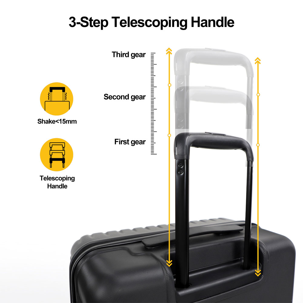 We use sturdy and durable waterproof ABS material, the material is light, not easy to deform, suitable for the environment of minus 5°-70°, cost-effective, textured appearance design, simple and fashionable. 360° mute universal wheel, slide smoothly, go where you want to go; sturdy telescopic handle, 300 times impact resistance test, multi-speed adjustment, comfortable operation; short handle is firmly installed; a zippered pocket inside for Store small items, large interior space, to meet various travel storage needs.