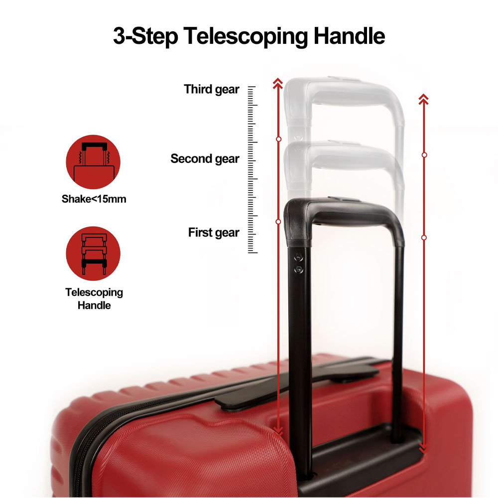 We use sturdy and durable waterproof ABS material, the material is light, not easy to deform, suitable for the environment of minus 5°-70°, cost-effective, textured appearance design, simple and fashionable. 360° mute universal wheel, slide smoothly, go where you want to go; sturdy telescopic handle, 300 times impact resistance test, multi-speed adjustment, comfortable operation; short handle is firmly installed; a zippered pocket inside for Store small items, large interior space, to meet various travel storage needs.